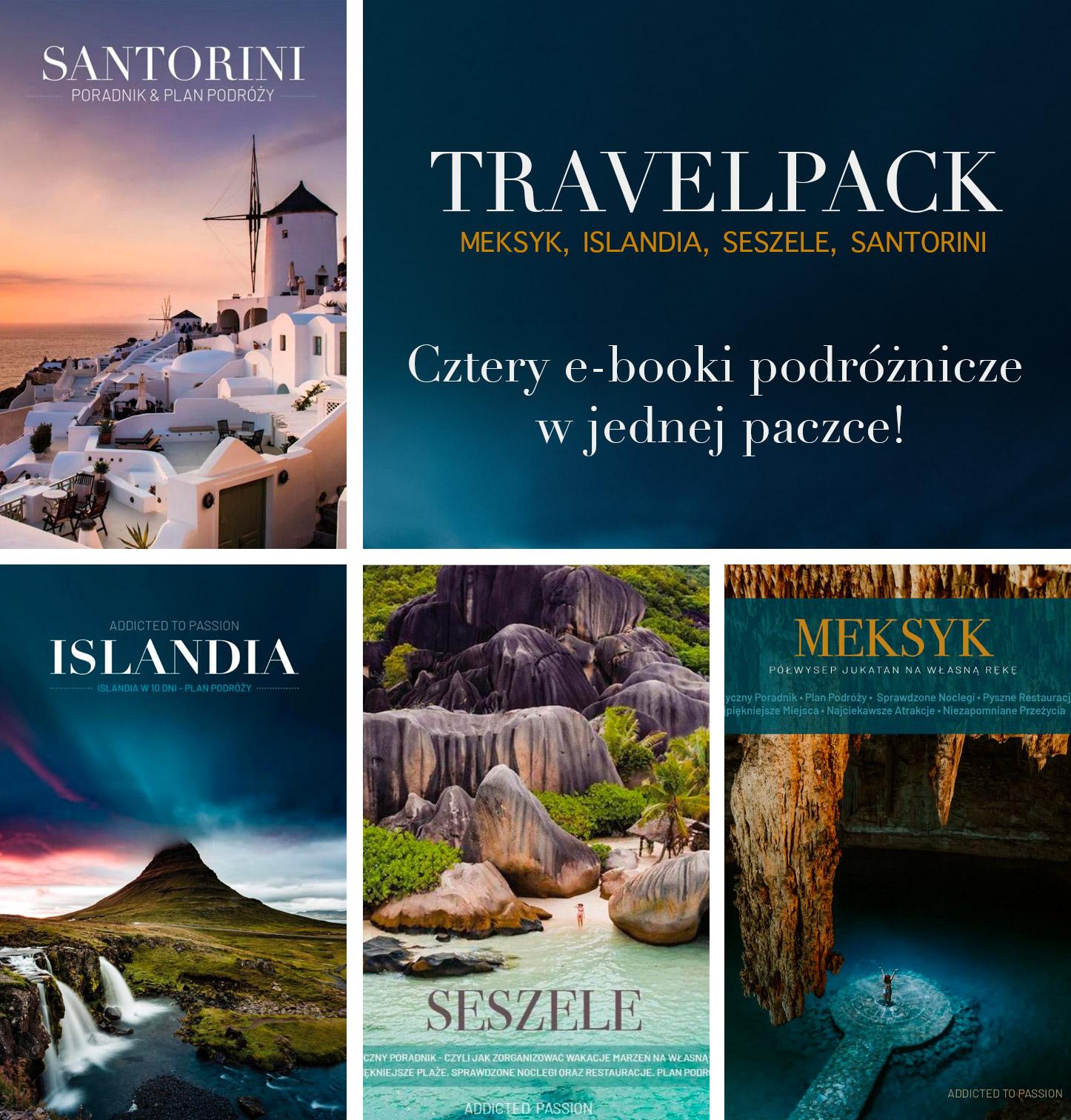 Aż 4 ebooki w jednej paczce! Tego jeszcze nie było! Kupując 4 e-booki oszczędzasz ponad 60%. Jeśli planujesz swoją podróż do Meksyku, na Seszele, Islandię lub Santorini to ta paczka jest dla Ciebie! Szczególnie jeśli nie masz czasu na czytanie przewodników oraz przeglądanie dziesiątek blogów? Zrobiliśmy to za Ciebie! W tych e-bookach znajdziesz nasze plany podróży oraz mapy wszystkich najpiękniejszych miejsc z powyższych zakątków. Najpiękniejsze plaże, najlepsze restauracje, wspaniałe przeżycia, wyspy warte odwiedzenia, przyjemne noclegi, ceny, oraz wiele innych przydatnych wskazówek, które pozwolą Ci samodzielnie zorganizować podróż marzeń! Nie przegap tego!