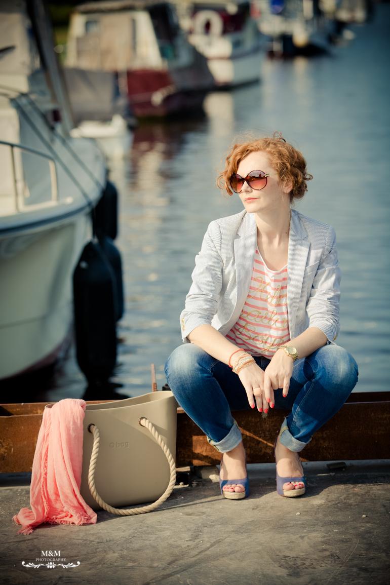 Co roku, a właściwie dwa razy w roku, na wyprzedażach kupuję jedną parę jeansów. To jest zawsze numer jeden na mojej liście zakupowej. Tak też stało się w tym sezonie. Od dawna upatrzone, trzy razy przymierzone i kiedy tylko przecena osiągnęła zadowalający mnie poziom, czyli -50% znalazły się w mojej szafie 🙂 Uwielbiam jeansy, to jedna z moich ulubionych części garderoby 🙂 Tak wiem, pewno się dziwicie, bo na blogu jeszcze mnie w nich nie widzieliście…sama się zastanawiam dlaczego 🙂 to chyba przez ten nadmiar wszystkich kwiatków i kolorów, które mnie w tym roku opętały 🙂 Ale nie martwcie się, przyjdzie i pora na więcej stylizacji z jeansami 🙂 Dzisiejszy debiut jeansowy w mojej ulubionej marynarskiej odsłonie 🙂 Paski, paseczki…pionowe i poziome opanowały w tym roku najpierw wszystkie sklepy, a później wszystkie blogi. U mnie pasków jeszcze nie było, być może z tego względu, że nie kupiłam w tym roku ani jednej pasiastej rzeczy. Poniższa koszulka i marynarka zakupione w tamtym roku na wyprzedażach. Całość stylizacji dopełnia efekt moich sobotnich łowów, podczas których popełniłam kolejny cudowny zakup 🙂 nie wiem czy się wam spodoba, bo jest dość oryginalny 🙂 to torba Obag. Pewno część z was już o niej słyszała 🙂 Nowoczesna torba zaprojektowana przez włoską firmę, którą możemy sobie skompletować według własnego uznania. Najpierw wybieramy kształt torby, kolor, później pasujący do niej pasek/uszy i wnętrze. W trzech krokach mamy nasza spersonalizowaną torbę. Jest bardzo wygodna, wykonana z EVA (Ethyleen Vinyl Acetaat) dzięki któremu jest bardzo leciutka. Ja wybrałam beżową, bo potrzebowałam torebkę właśnie w takim kolorze, uniwersalną, do jeansów, na plażę, czy też na zakupy. Jak wam się podoba? 🙂