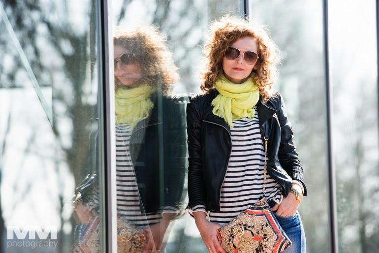I jeszcze słów kilka odnośnie dzisiejszego zestawu. Wreszcie kupiłam ramoneskę! Jej, ale ja się jej naszukałam, chyba z pół roku, albo nawet więcej. Albo była za krótka, albo za długa, albo za prosta, albo za bardzo udziwniona. No i kilka dni temu, zupełnie przypadkiem znalazłam soją idealną w Zarze 🙂 Jest cudowna, leciutka, lekko wcięta, nadaje ładny kobiecy kształt sylwetce i odkąd ją kupiłam nie rozstaję się z nią na krok. Coś czuję, że to będzie mój numer jeden na wiosnę 🙂 Ramoneskę połączyłam z wiosennym trendem, czyli paskami i torebką z RI, którą też znalazłam przypadkiem, przy okazji poszukiwań idealnej baby blue. Baby blue dalej nie znalazłam, ale ta skradła moje serce. Do tego od razu dorwałam wygodne butki i mam zestaw na co dzień, na zakupy, do miasta i na wypad z koleżankami 🙂 Jak wam się podobam w takim wydaniu? 🙂