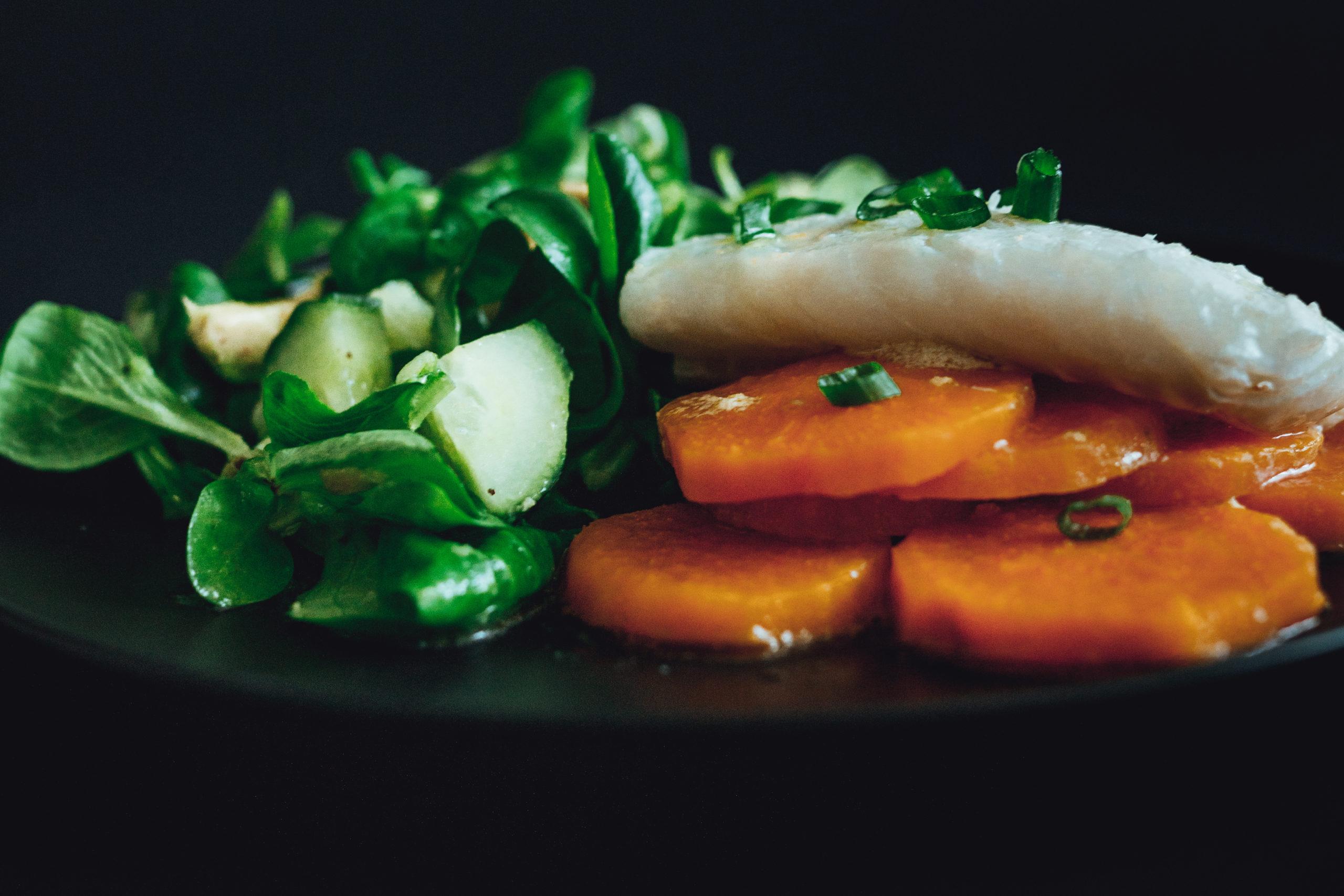 Piekarnik nagrzewamy do 180 stopni. Masło mieszamy ze skórką oraz sokiem z połowy limonki, oraz szczyptą soli. Słodkie ziemniaki obieramy, kroimy na pół centymetrowe plasterki, gotujemy kilka minut (5-8) tak żeby były prawie ugotowane, odcedzamy, układamy na papierze do pieczenia. Na wierzch kładziemy posolonego dorsza, oraz łyżeczkę masła limonkowego. Robimy z papieru do pieczenie lub folii aluminiowej sakiewkę, spinamy spinaczami, albo związujemy nitką i wkładamy do nagrzanego do 180 stopni piekarnika na 15-20 minut. W czasie kiedy rybka się piecze robimy sałatkę. Kroimy awokado, ogórka, młodą cebulkę i polewamy dressingiem, przed podaniem mieszamy z roszponką.