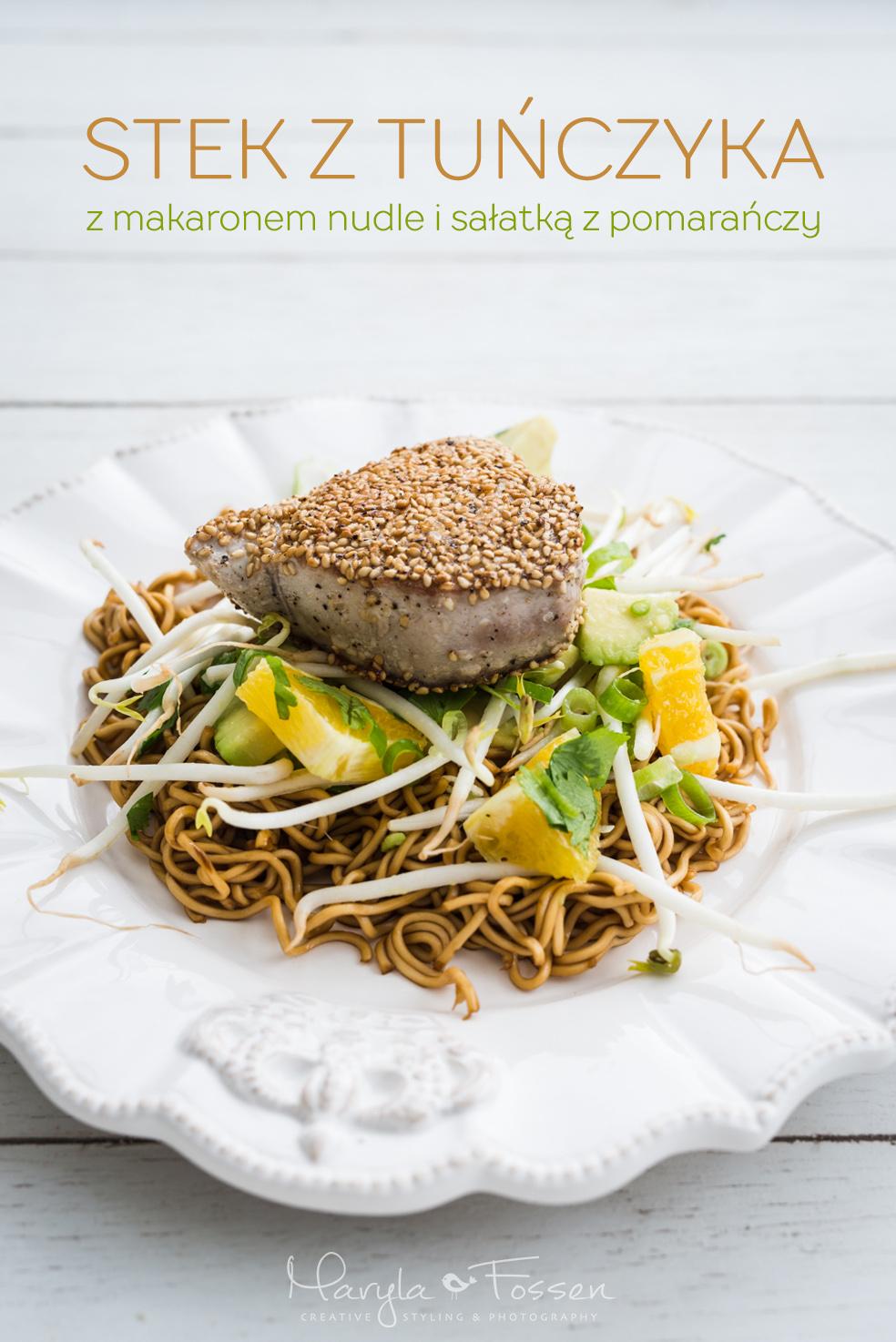Stek z tuńczyka z makaronem nudle i sałatką z pomarańczy