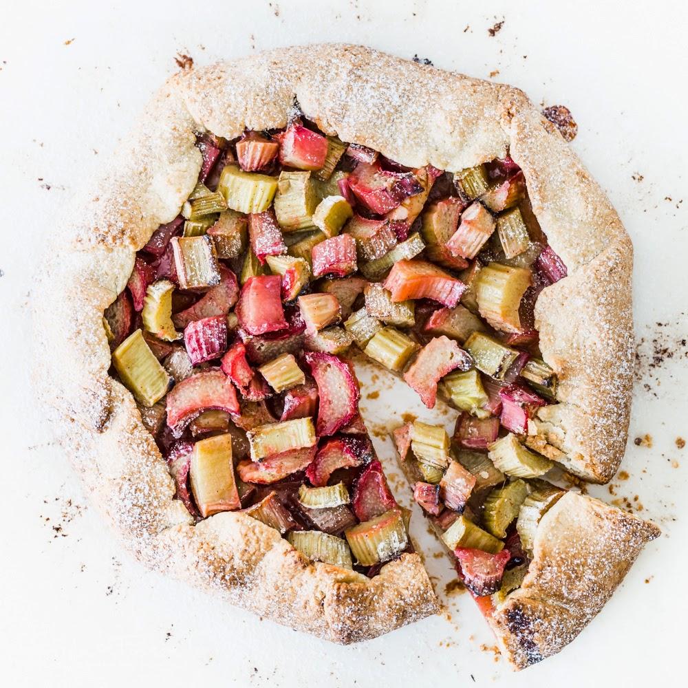 Piekarnik nagrzać do 200 stopni C. Ciasto rozwałkować pomiędzy dwoma arkuszami papieru do pieczenia na okrąg o średnicy ok. 40 cm. Przenieść na blachę, odkleić górny arkusz. Na środku ułożyć rabarbar pozostawiając ok. 4 – 5 cm wolnego brzegu. Rabarbar skropić sokiem z limonki tak aby rozpuściła się mąka na wierzchu rabarbaru. Zawinąć ciasto na rabarbar, wstawić do piekarnika i piec przez ok. 35 – 40 minut na złoty kolor.