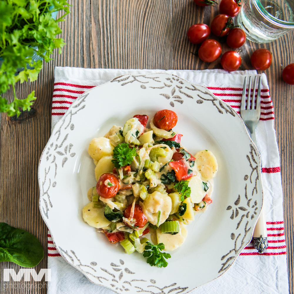 Piekarnik nagrzewamy do 200 stopni. Ziemniaki obieramy i kroimy w 0,5 cm plasterki, gotujemy w osolonej wodzie przez ok 8 minut tak żeby były prawie miękkie. Odcedzamy i zostawiamy na sitku. Z papryki wydrążamy nasionka, kroimy w na 2 cm kawałki. Można też użyć zwykłej papryki, ale jest twardsza i ja osobiście wolę te długie. Mają też słodszy i łagodniejszy smak. Łodygi selera myjemy i kroimy na 0,5 cm kawałki (w razie potrzeby można usunąć łyka). Cebule obieramy, kroimy w piórka. W woku lub na dużej patelni rozgrzewamy masło i olej. Wrzucamy najpierw cebulę z pokrojonym drobniutko czosnkiem oraz z przyprawą cajun. Smażymy ok 2 minut. Następnie wrzucamy pokrojony seler oraz paprykę i smażymy kolejne 3-4 minuty. Dodajemy mąkę. Mieszamy. Po minucie wlewamy bulion warzywny, mascarpone, oraz połowę startego parmezanu. Na malutkim ogniu gotujemy ok 8-10 minut. Tak żeby warzywa były miękkie, ale wciąż lekko chrupiące. Pietruszkę kroimy drobno. W rzucamy na samym końcu razem ze szpinakiem i pomidorkami koktajlowymi. Żaroodporne naczynie smarujemy oliwą. Wykładamy najpierw ziemniaki, a na wierzch wlewamy mieszankę warzywną. Posypujemy resztką startego parmezanu i zapiekamy 15 min w piekarniku. Wszystkie warzywa są już gotowe, więc chodzi tylko rozpuszczenie parmezanu. SMACZNEGO!