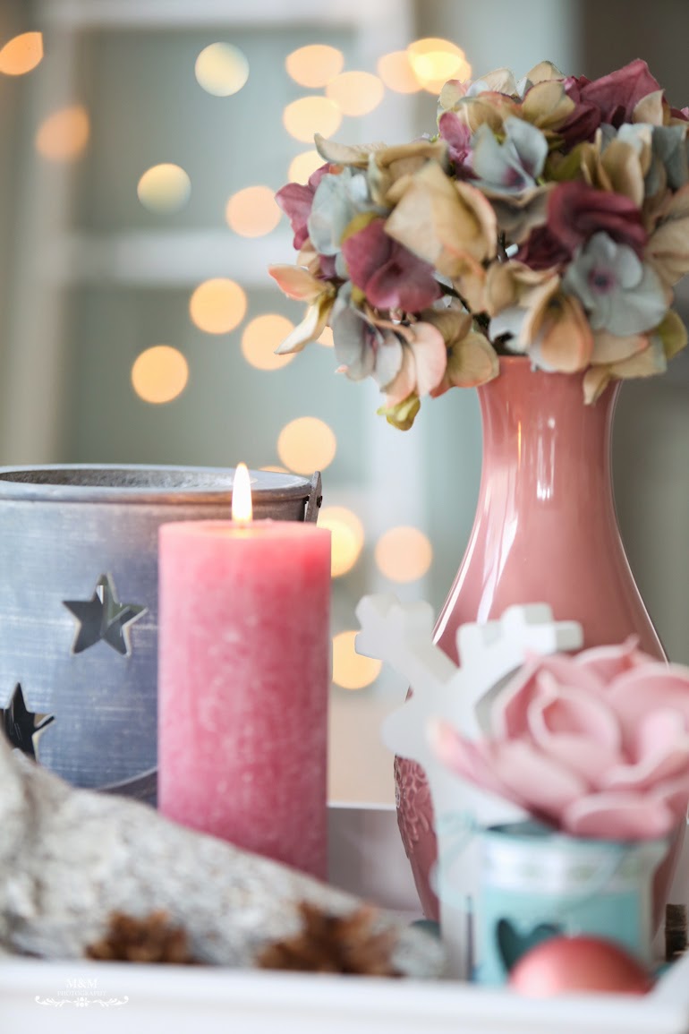 Jeszcze raz dziękuję Gadget za wspaniałe inspiracje 🙂 Kolejna dekoracja to kompozycja, która znajduje się na naszym stoliku kawowym. Moja ulubiona taca, z gwiazdkowym lampionem, który udało mi się wczoraj zakupić z 50% rabatem, Kolorystyka utrzymana w kolorach salonu, świeca w koralowym kolorze, kilka bąbek, szyszek, kwiatków i gotowe 🙂