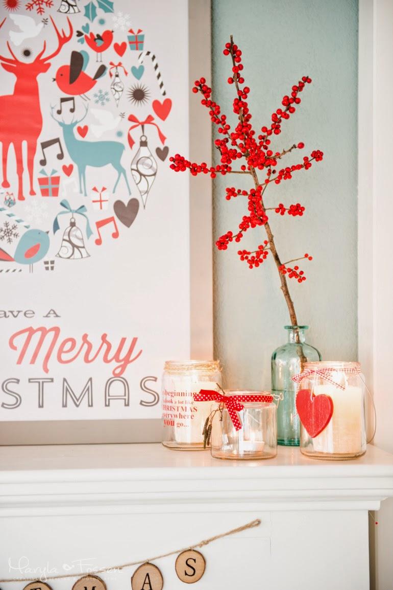 Na kominku zagościły lampiony. Wszystkie były ze świątecznymi napisami, tak więc troszkę się naszorowałam żeby je zmyć. Każdy dostał ode mnie inne świąteczne ubranko. W ruch poszły czerwone wstążeczki, gałązki, serduszka, koronki i gotowe 🙂