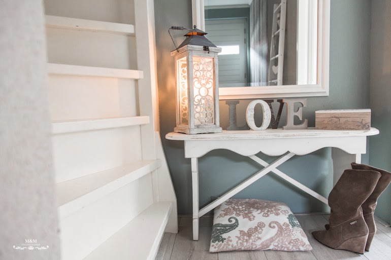 A co się zmieniło? Po pierwsze i najważniejsze kolory 🙂 Tutaj możecie zobaczyć przedpokój przed zmianami Klik. Jak widzicie było baaardzo fioletowo 🙂 No, ale po pierwsze fioletowy już nam się troszkę znudził, a po drugie trzeba było dopasować się kolorystycznie do reszty naszego domku. A że ostatnio mam zajawkę biel i przybrudzone kolory stąd też wybór taki a nie inny 🙂